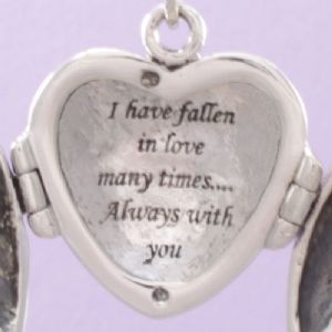 The Angel Wing Heart locket is a large sterling silver heart-shaped locket on a 925 silver chain. The doors of the locket are a pair of folded angel’s wings which open individually. The rear of the case is plain silver and the interior is coated to ensure that whatever you put in the locket stays pristine. This locket is also engraved inside and the words are “I have fallen in love many times ….. Always with you”