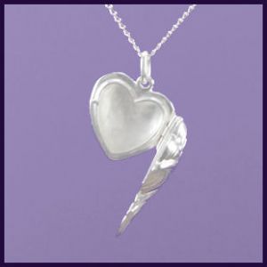 The Angel Wing Heart locket is a sterling silver heart-shaped locket on a 925 silver chain.  This is a NEW design and the Angel Wings look like they are wrapped around the heart.  The Locket opens to the side and the back is plain and shiny and can be engraved