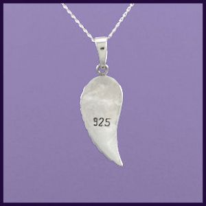 This Right sided Sterling Silver Angel Wing is beautifully detailed and has a tear drop shaped piece of Mother of Pearl at the top of the Wing. This Pendant is presented on an Italian 925 silver chain. .