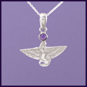 The Isis necklace is a sterling silver pendant of the Ancient Egyptian depiction of the goddess Isis with an amethyst cabouchon on a 925 silver chain.