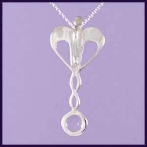 The Healing Angel with Quartz is a very simple, elegant design. The wings form the shape of a heart and the wing tips entwine to embrace the quartz. She comes on a sterling silver chain.